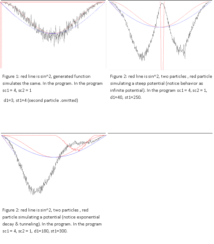 The program is listed here It is written in liberty basic and you can download it here. And if that is not enough I simulated two particles where the second acts like a potential. The two particles interact according to some basic rule (see the program). When you make the potential narrow i.e. the energy high, the first particle gets constrained and its probability goes to zero at the potential (fig. 2). When the second particle has a wide base then it very much acts like a square well and the probability looks exponential inside it (fig. 3). And tunneling phenomenon is clear, continuity automatically satisfied. In other words Schrödinger equation popped out of some geometry with rules. Crazy enough? No? Here is some more: I can make the particles interact without their wave functions overlapping just by not restricting the size of the associated length “li”. That is spooky action at distance. Left as an exercise.